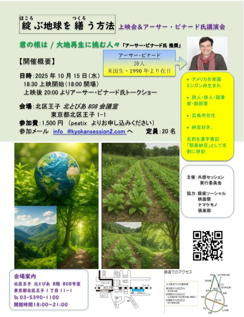 本イベントは、映画上映とトークショーを通じて「大地の再生」と「人の生き方の再生」を考える特別企画です。上映作品は、詩人・アーサー・ビナード氏が強く推奨するドキュメンタリー映画『君の根は / 大地再生に挑む人々』。世界各地で土を蘇らせるために奮闘する人々の姿を描き、環境再生への希望と未来への可能性を提示する作品です。上映後には、アーサー・ビナード氏によるトークショーを開催し、映画で語られたテーマをさらに深く掘り下げます。